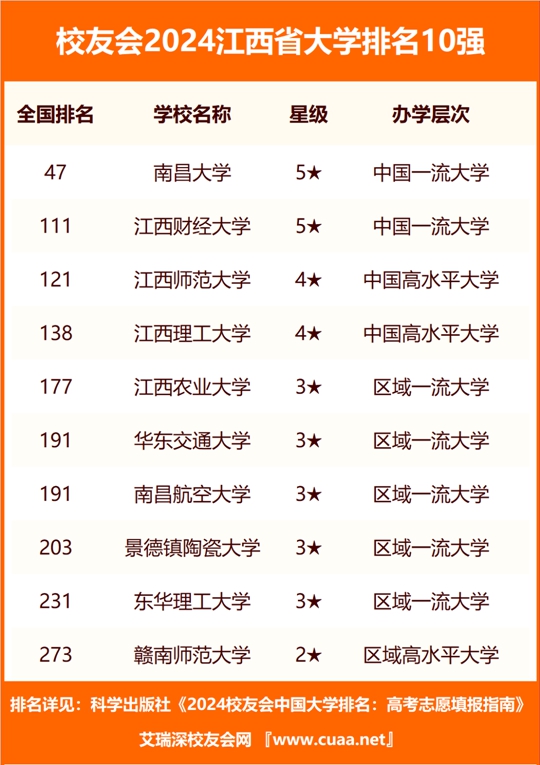 為給2024年全國高考考生選擇填報江西省高校提供參考,2024年1月16日,全國第三方大學(xué)評價機構(gòu)艾瑞深校友會網(wǎng)(Cuaa.net)正式公布《2024校友會中國大學(xué)排名:高考志愿填報指南》,發(fā)布最新校友會2024江西省大學(xué)排名,該書將由科學(xué)出版社公開出版發(fā)行。