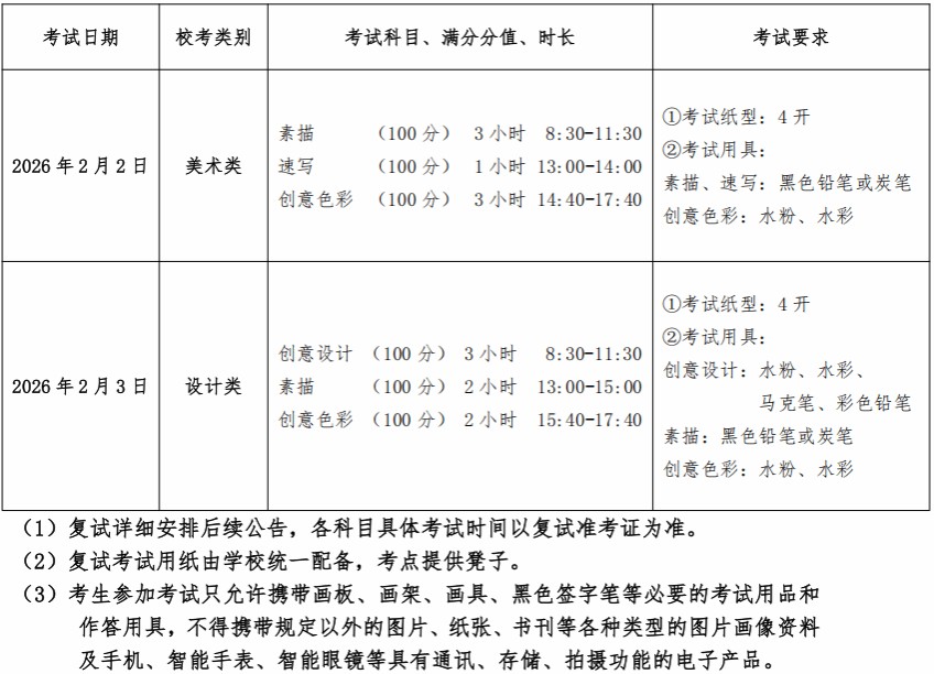 4.學(xué)校根據(jù)教育部有關(guān)規(guī)定,分別按不超過校考美術(shù)類、設(shè)計類包含專業(yè)招生計劃數(shù)的4倍按類別發(fā)放?己细褡C。末位考生?汲煽兛偡窒嗤瑫r,美術(shù)類依次比較考生素描、創(chuàng)意色彩、速寫單科成績作為排序依據(jù);設(shè)計類依次比較考生創(chuàng)意設(shè)計、素描、創(chuàng)意色彩單科成績作為排序依據(jù)。專業(yè)?紡(fù)試單科成績不及格(未達60分),視為?疾缓细瘛