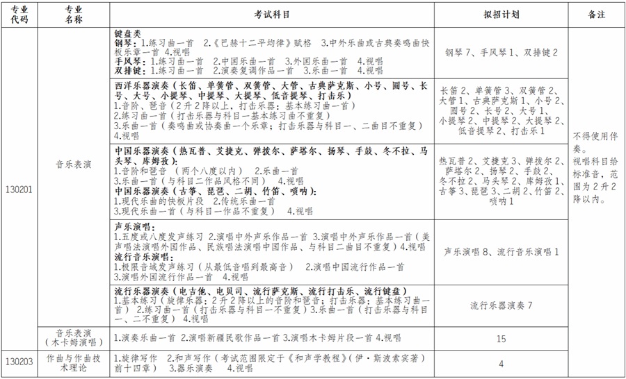 1.以上?紝I(yè)培養(yǎng)學(xué)院為音樂(lè)學(xué)院,學(xué)制4年,面向全國(guó)招生,不編制分省計(jì)劃,最終招生計(jì)劃以上級(jí)主管部門(mén)批復(fù)為準(zhǔn)。