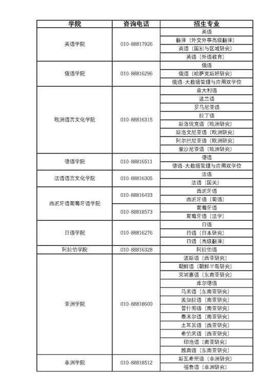 (一)外語類:英語、英語(國別與區(qū)域研究)、英語(外語教育)、翻譯(外交外事高級(jí)翻譯)、日語、日語(日本研究)、日語(高級(jí)翻譯)、俄語、俄語(哈薩克斯坦研究)、俄語-大數(shù)據(jù)管理與應(yīng)用雙學(xué)位、德語、德語-大數(shù)據(jù)管理與應(yīng)用雙學(xué)位、法語、法語(國際關(guān)系)、西班牙語、西班牙語(葡語)、葡萄牙語、葡萄牙語(法學(xué))、阿拉伯語、阿爾巴尼亞語(歐洲研究)、波蘭語、斯洛伐克語(歐洲研究)、羅馬尼亞語、意大利語、斯洛文尼亞語(歐洲研究)、愛沙尼亞語(歐洲研究)、拉丁語、波斯語(西亞研究)、朝鮮語(朝鮮半島研究)、印地語(南亞研究)、柬埔寨語(東南亞研究)、馬來語(東南亞研究)、希伯來語(西亞研究)、越南語(東南亞研究)、土耳其語(西亞研究)、泰米爾語(南亞研究)、普什圖語(南亞研究)、孟加拉語(南亞研究)、庫爾德語、斯瓦希里語(非洲研究)、祖魯語(非洲研究)等,共41個(gè)專業(yè)及方向。