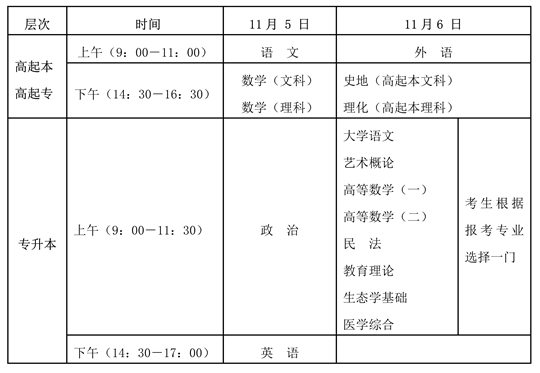 (一)專升本、高起本、高起專三種層次對(duì)應(yīng)的報(bào)考科類、統(tǒng)考科目及代碼如下:
