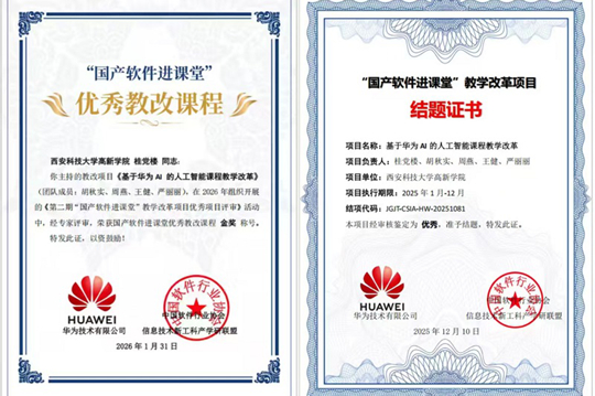 近日,中國軟件行業(yè)協(xié)會、信息技術(shù)新工科產(chǎn)學(xué)研聯(lián)盟聯(lián)合公布第二期“國產(chǎn)軟件進(jìn)課堂”教學(xué)改革項(xiàng)目評審結(jié)果,西安科技大學(xué)高新學(xué)院桂黨樓老師團(tuán)隊(duì)主導(dǎo)的《基于華為AI的人工智能課程教學(xué)改革》項(xiàng)目憑借突出的創(chuàng)新性、扎實(shí)的實(shí)踐成效與顯著的育人價(jià)值,榮獲優(yōu)秀項(xiàng)目金獎(jiǎng),成為全國高校產(chǎn)教融合與課程改革的典范之作。