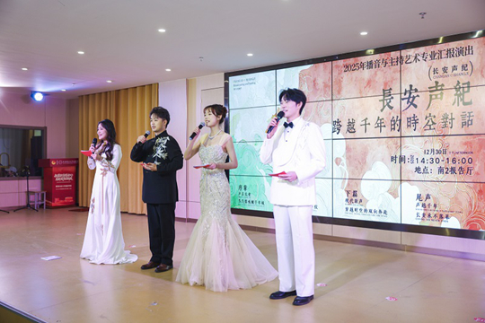 當聚光燈照亮西安科技大學高新學院的劇場舞臺,一場以“長安聲紀”為主題的播音與主持藝術專業(yè)匯報演出精彩啟幕。這不是一場單純的文藝展演,而是課堂教學成果的集中檢閱,是實踐教學反哺專業(yè)育人的生動課堂,更是高新學子以聲音為媒、傳承長安文脈的青春宣言!安ヒ襞c主持不僅是技術的藝術,更是思想的藝術。今夜,讓我們共同見證,年輕的聲音如何跨越千年,觸摸一座城市永恒的靈魂。”演出伊始,經(jīng)濟管理與傳媒藝術學院常務副院長李文教授的致辭,為整場演出賦予了超越期末展示的深刻立意,點明了學院培養(yǎng)“以聲音承載文化的卓越傳播者”的育人目標。演出分為“歷史回響”與“現(xiàn)代新聲”上下兩篇,將專業(yè)課堂所學轉(zhuǎn)化為兼具藝術性與思想性的舞臺呈現(xiàn),讓實踐教學的成果在舞臺上熠熠生輝。