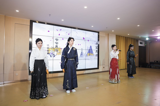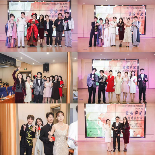 在“歷史回響”篇章,學生們將《播音創(chuàng)作基礎》課程中的“內(nèi)三外四”基本功,轉(zhuǎn)化為生動的舞臺敘事。集體朗誦《長安,我們來了》氣勢恢宏,字正腔圓的表達里,是新時代傳播者主動叩響歷史與文明大門的專業(yè)信念;《長安詩箋》中,七位學子化身詩人與過客,用聲音演繹李白的豪放、杜甫的沉郁、王維的空靈,讓千年詩詞在舞臺上重新“呼吸”;《繁花》以肢體語言勾勒盛世長安的絢爛畫卷,將大唐自信開放的時代精神融入當代青年的舞姿;《長安會客廳》創(chuàng)新采用歷史人物訪談形式,考驗學生即興口語表達與歷史人文素養(yǎng)的融合能力;《敕勒歌》的悠遠旋律,是對多元文化交匯長安的歷史致敬;《城磚的秘密》更創(chuàng)造性實踐“聲音考古學”,五位學子以精妙的聲音設計構(gòu)建考古現(xiàn)場聲景,帶領觀眾潛入時空深處,生動詮釋了“文化承載者”的角色定位。