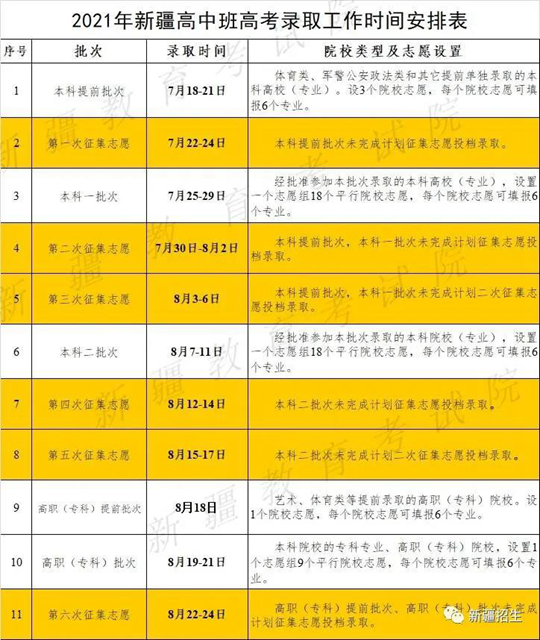 2021年新疆高中班高考錄取工作計劃于7月18日開始,預(yù)計8月24日結(jié)束,設(shè)本科提前批次、本科一批次、本科二批次、高職(?疲┨崆芭魏透呗殻▽?疲┡5個錄取批次。各批次正式投檔錄取結(jié)束后,根據(jù)院校剩余計劃情況分別安排1次或2次網(wǎng)上征集志愿。