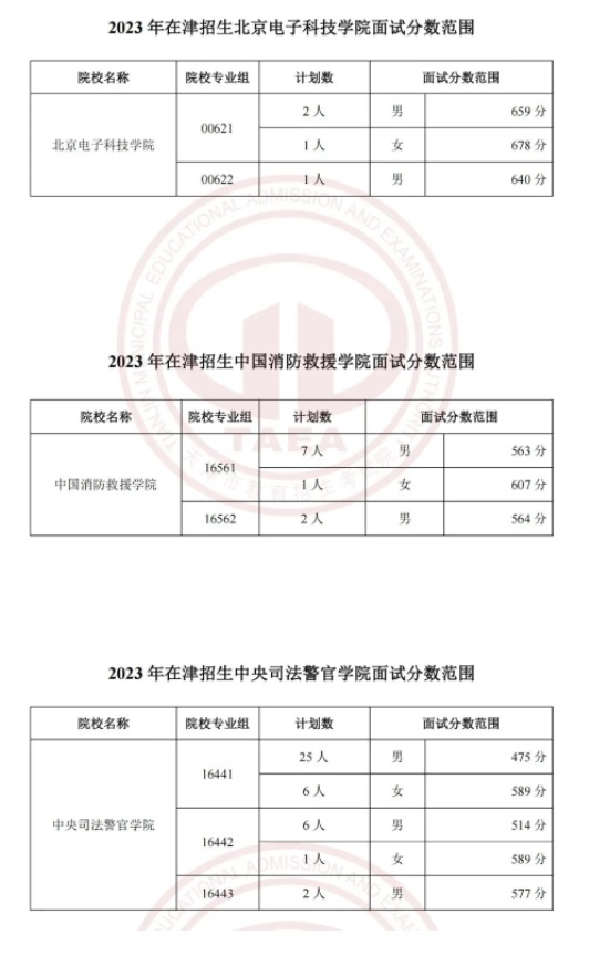 今年在津招生的北京電子科技學(xué)院、中國消防救援學(xué)院和中央司法警官學(xué)院面試分?jǐn)?shù)范圍確定(具體分?jǐn)?shù)范圍見附表)。