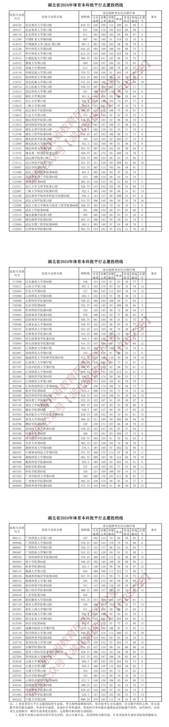 湖北省2024年體育本科批平行志愿投檔線