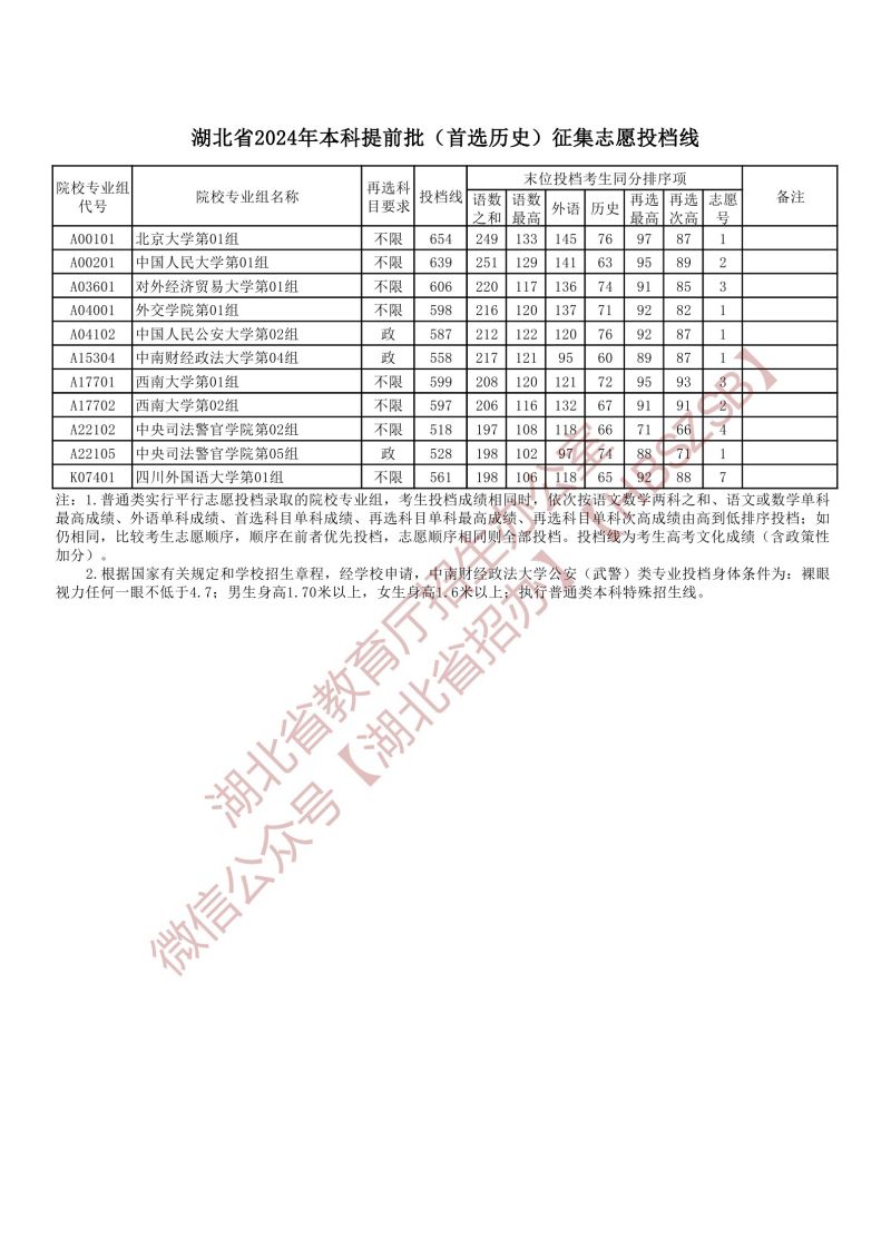 湖北省2024年本科提前批(首選歷史)征集志愿投檔線