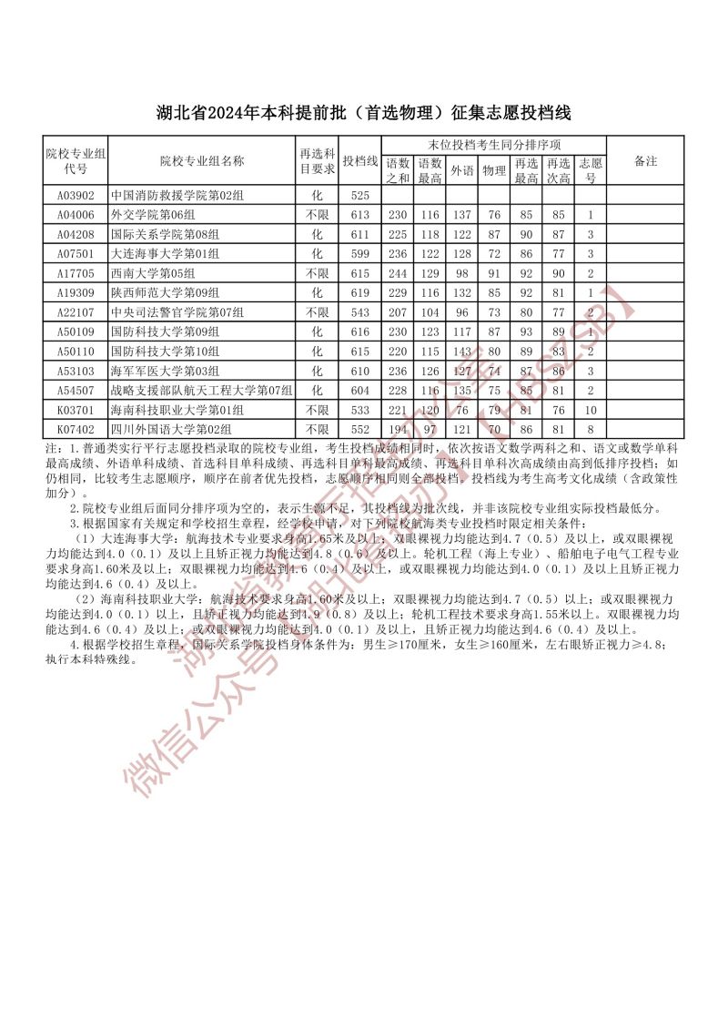 湖北省2024年本科提前批(首選物理)征集志愿投檔線