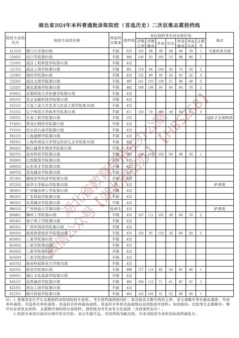 湖北省2024年本科普通批錄取院校(首選歷史)二次征集志愿投檔線