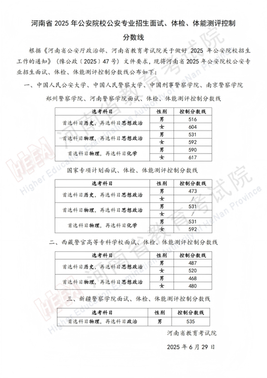河南省2025年公安院校公安專業(yè)招生面試、體檢、體能測評控制分?jǐn)?shù)線