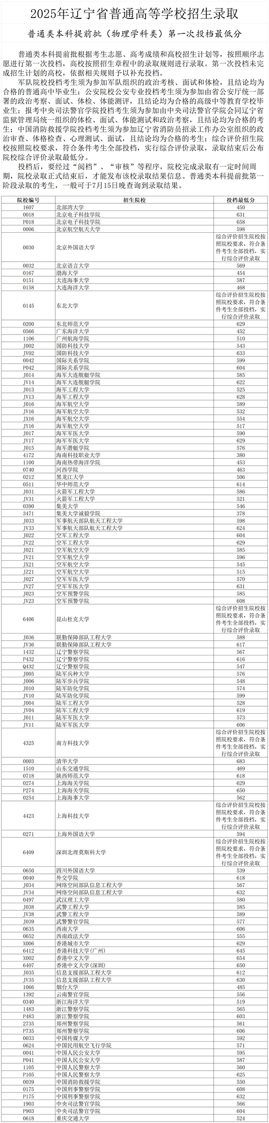 2025年遼寧省普通高等學(xué)校招生錄取普通類本科提前批(物理學(xué)科類)第一次投檔最低分