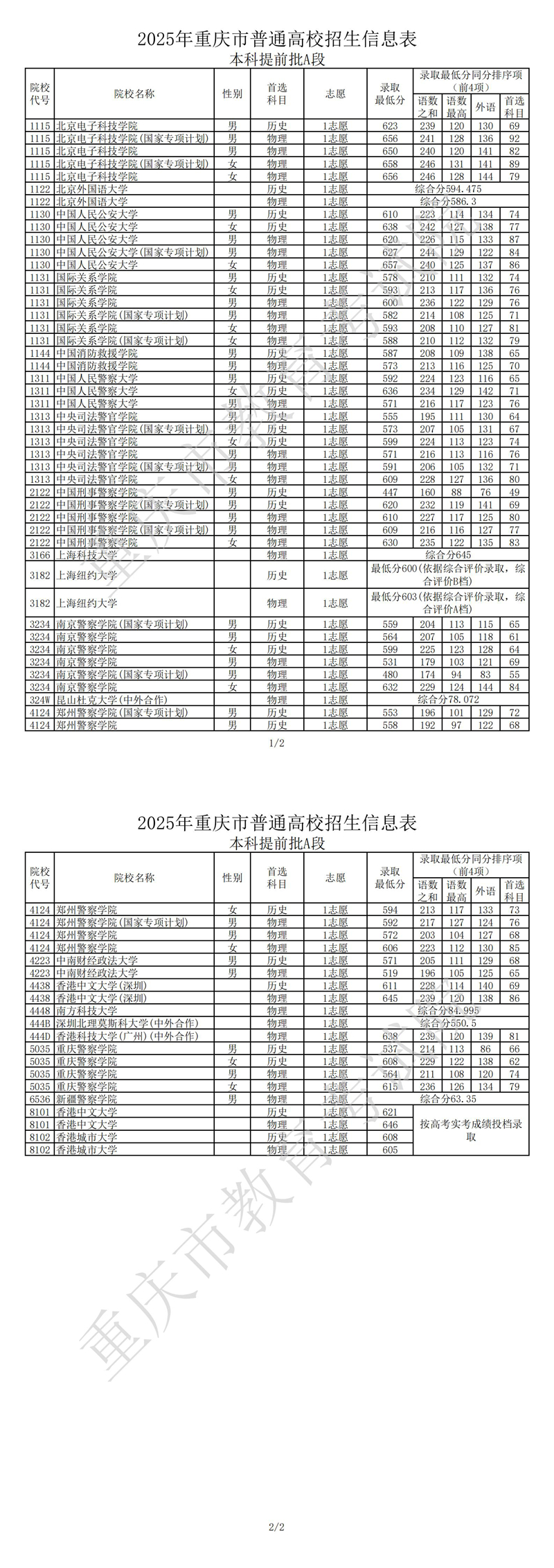 2025年重慶市普通高校招生信息表本科提前批A段