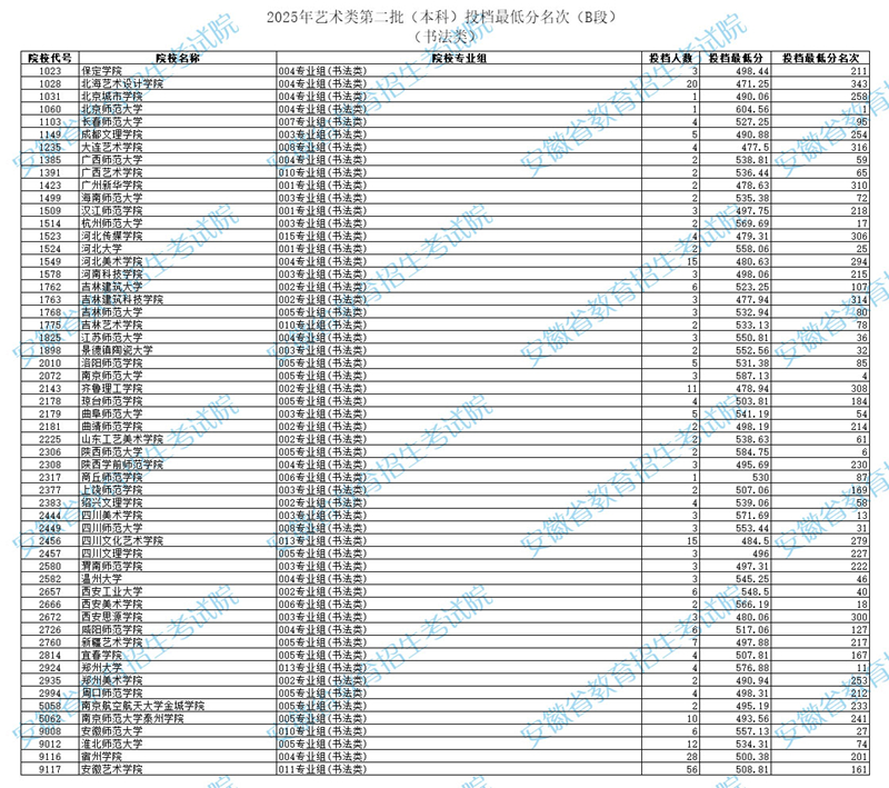 安徽:2025年藝術(shù)類第二批(本科)投檔最低分名次(書法類)