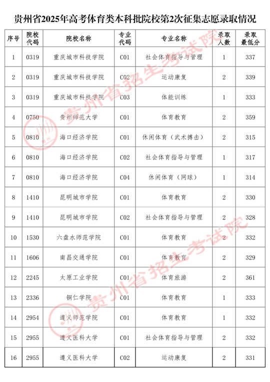 貴州省2025年高考體育類本科批院校第2次征集志愿錄取情況
