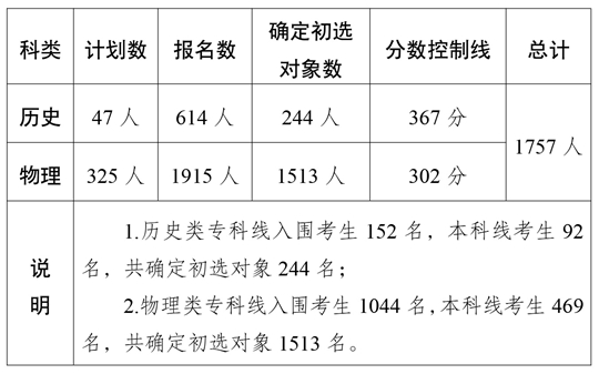 6月25日至30日,全區(qū)2866名考生填報定向培養(yǎng)軍士志愿,符合招收條件2529人,按照本科線報名考生直接確定為體格檢查和政治考核初選對象,?凭考生以考分從高到低的順序,按招收計劃數(shù)3.2倍比例劃定入圍分?jǐn)?shù)線,共確定初選對象1757人,具體公布如下: