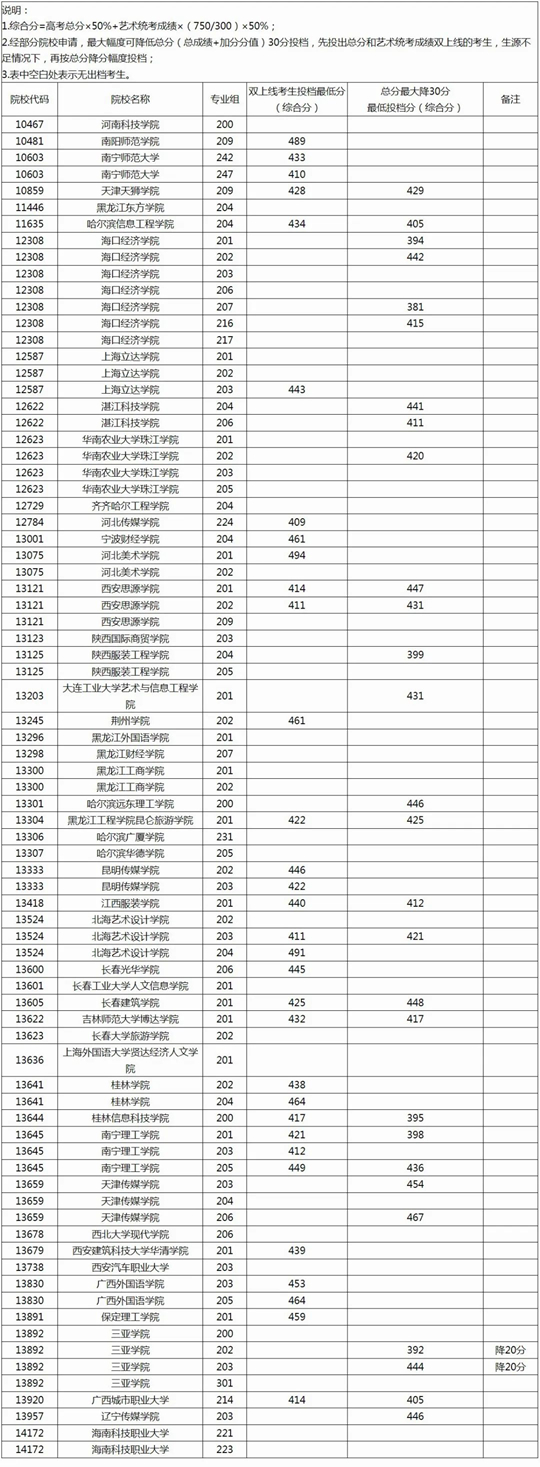 2025年本科提前批藝術類本科第二批院校專業(yè)組第三次征集投檔最低分數(shù)線(首選物理科目組)