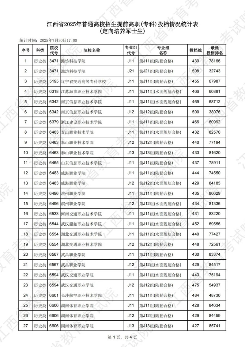 江西省2025年普通高校招生提前高職(?)投檔情況統(tǒng)計表(定向培養(yǎng)軍士生)