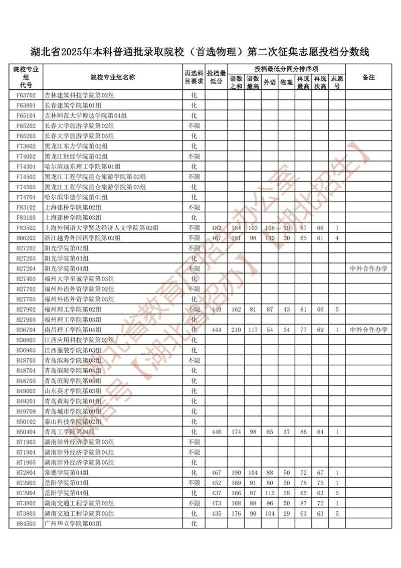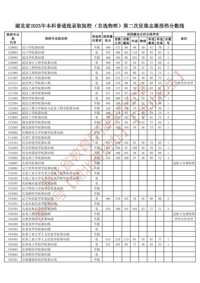 湖北省2025年本科普通批錄取院校 (首選物理)第二次征集志愿投檔分?jǐn)?shù)線
