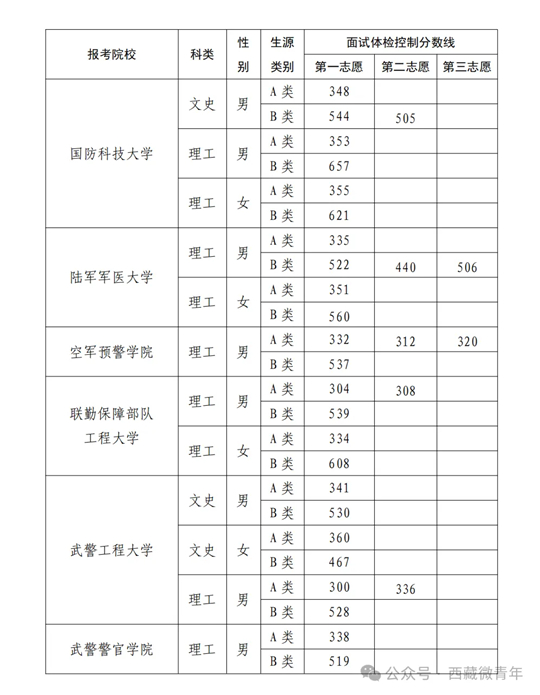 根據(jù)中華人民共和國教育部,中央軍委政治工作部、中央軍委訓練管理部《關(guān)于印發(fā)<2025年軍隊院校招收普通高中畢業(yè)生計劃>的通知》規(guī)定,結(jié)合考生報考軍隊院校實際情況,西藏軍區(qū)招生工作辦公室會同西藏自治區(qū)教育考試院按照相關(guān)規(guī)定,按比例劃定參加2025年軍隊院校在藏招收普通高中畢業(yè)生面試體檢控制分數(shù)線(具體如下)。請上線考生按前期公告要求到指定地點參加面試體檢。
