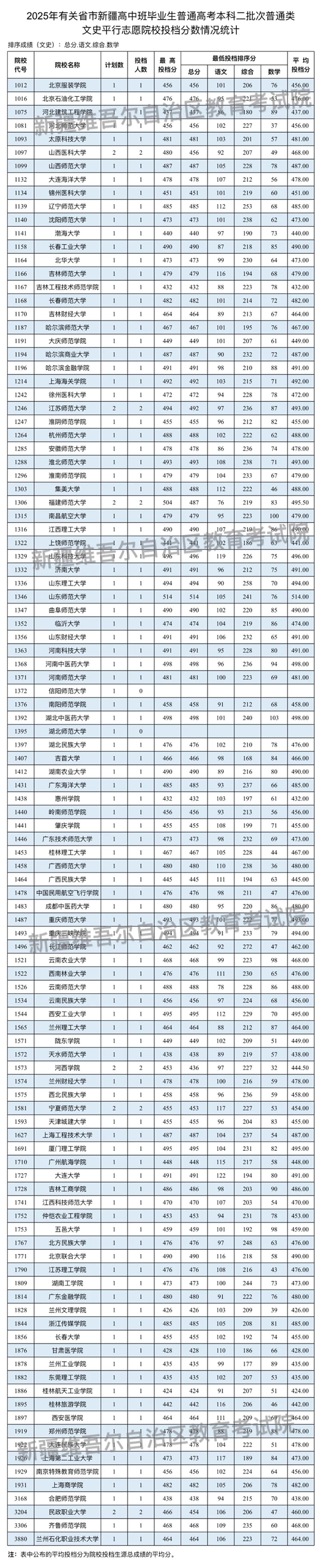 按照錄取工作安排,自治區(qū)2025年普通高校招收有關(guān)省市新疆高中班畢業(yè)生本科二批次8月4日正式投檔錄取,新疆教育考試院根據(jù)投檔原則進(jìn)行了投檔,現(xiàn)將相關(guān)院校投檔情況公布如下: