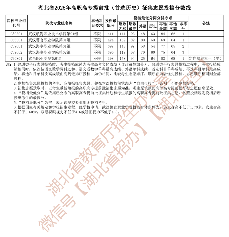 湖北省2025年高職高專(zhuān)提前批(首選歷史)征集志愿投檔分?jǐn)?shù)線(xiàn)