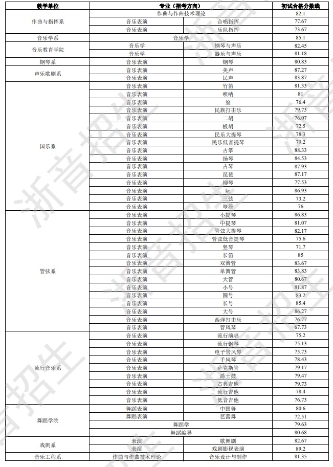 浙江音樂學院2026年本科招生專業(yè)校考初試合格分數(shù)線