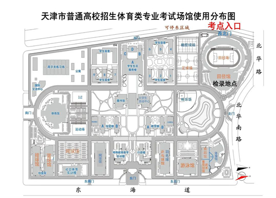天津體育學(xué)院新校區(qū)(靜海區(qū)團(tuán)泊新城西區(qū)東海道16號(hào))?荚嚠(dāng)天,考生須從學(xué)校西北門進(jìn)入考點(diǎn)。
