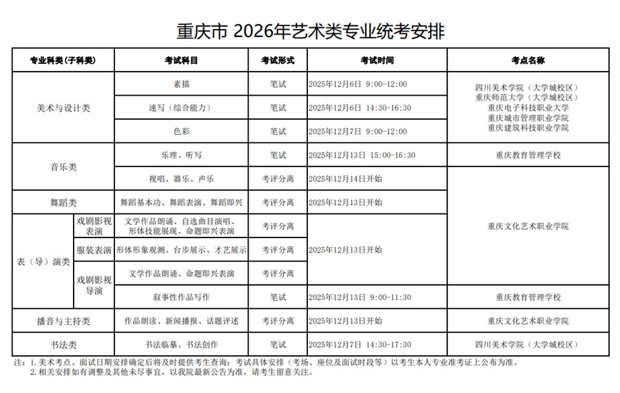 重慶市2026年藝術(shù)類專業(yè)統(tǒng)考安排