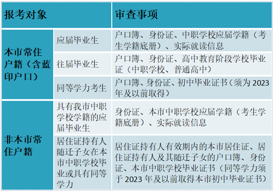 。2)具有本市常住戶籍的普通中專、職業(yè)高中、技工學(xué)校(以下簡稱“中職學(xué)!保┊厴I(yè)生、普通高中往屆畢業(yè)生、同等學(xué)力考生;具有本市中職學(xué)校正式學(xué)籍的應(yīng)屆畢業(yè)生;在本市中職學(xué)校畢業(yè)或具有同等學(xué)力的本市居住證持有人隨遷子女。