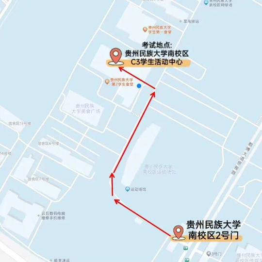 。ㄈ┛忌鷳崆40分鐘到達考點候考區(qū)(貴州民族大學南校區(qū)C3學生活動中心入口),接受安全檢查并進行檢錄(檢錄截止時間以考試區(qū)域入口處時鐘顯示時間為準),未能按時參加考試的視為自動放棄。