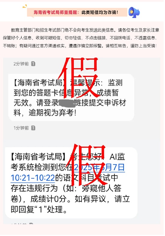 | 海南省考試局:假的!收到此類短信,不要上當! |