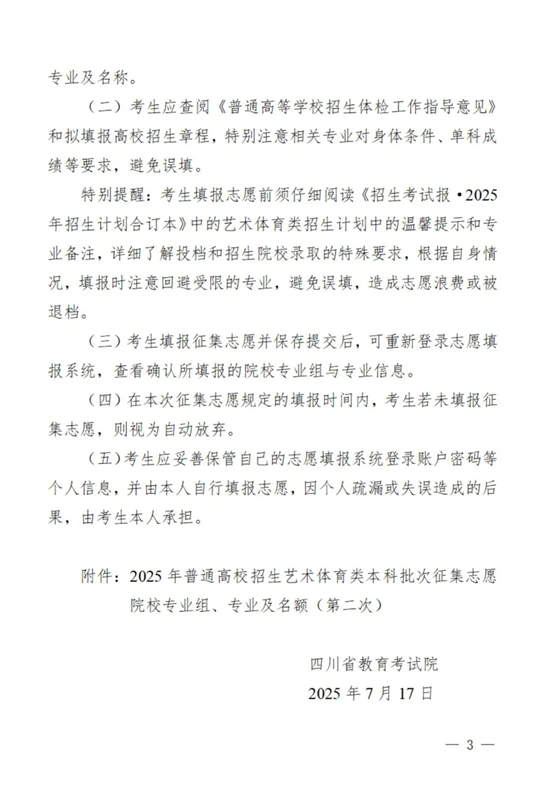 關于四川省2025年藝術體育類本科批次未完成計劃院校第二次征集志愿的通知