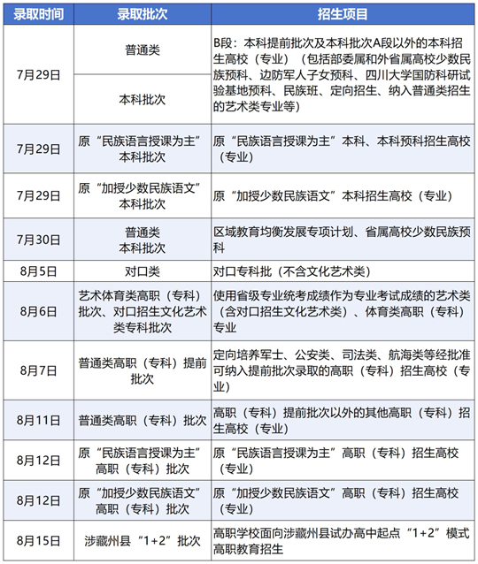 目前,我省已經(jīng)順利完成強(qiáng)基計(jì)劃、藝術(shù)體育類本科批次、普通類本科提前批次、國(guó)家專項(xiàng)計(jì)劃、地方專項(xiàng)計(jì)劃、高校專項(xiàng)計(jì)劃、對(duì)口本科批、普通類本科批次A段等10個(gè)批次(段)的投檔錄取,考生可以查詢錄取結(jié)果。接下來(lái),陸續(xù)進(jìn)行的其他批次(段)預(yù)計(jì)錄取時(shí)間見(jiàn)下表,考生和家長(zhǎng)可根據(jù)時(shí)間來(lái)進(jìn)行錄取結(jié)果查詢。
