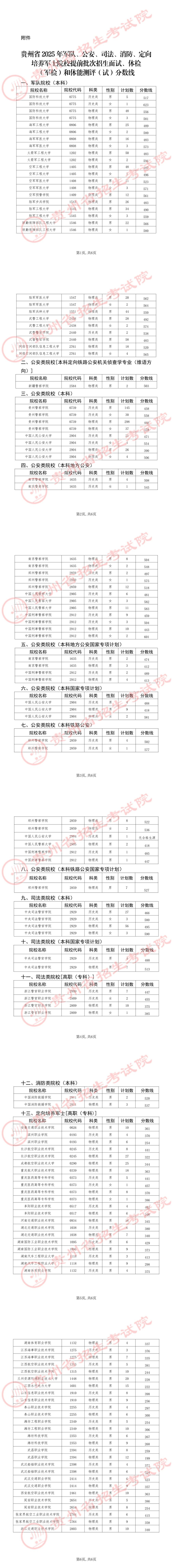 。ǘ┲袊嗣窆泊髮W(xué)、中國人民警察大學(xué)、中國刑事警察學(xué)院、鄭州警察學(xué)院、南京警察學(xué)院、貴州警察學(xué)院按照《貴州省公安廳 貴州省教育廳關(guān)于印發(fā)〈貴州省2025年公安院校公安專業(yè)招生工作方案〉的通知》規(guī)定的比例,劃定體檢、體能測評、面試分?jǐn)?shù)線(考生成績不得低于本科錄取控制分?jǐn)?shù)線),并組織上線考生參加體檢、體能測評、面試。