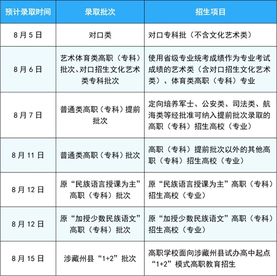 8月,高考錄取進(jìn)入普通類(lèi)、藝術(shù)類(lèi)、體育類(lèi)等多個(gè)招生類(lèi)型的高職(?疲┡,各批次預(yù)計(jì)錄取時(shí)間詳見(jiàn)下表。