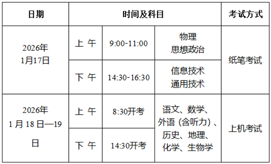 我市2025-2026學(xué)年度第一學(xué)期普通高中學(xué)業(yè)水平合格性考試將于2026年1月17日-19日進(jìn)行,F(xiàn)將考試及報(bào)名有關(guān)安排公告如下: