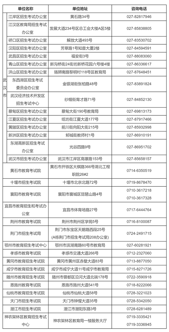 備注:報名期間,各縣(市、區(qū))教育考試機構接受考生咨詢與服務,考生可登錄各市州教育考試機構官網(wǎng)或致電市州教育考試機構查詢了解咨詢電話。