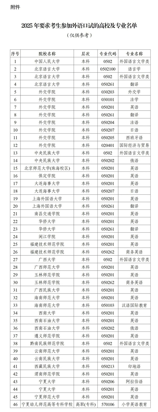 附件:2025年要求考生參加外語口試的高校及專業(yè)名單