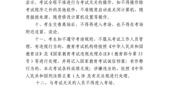 2.誠信參加考試?荚嚻陂g,教育、公安、網(wǎng)信、無線電管理等部門將對考場內(nèi)及周邊環(huán)境進行整治,對涉嫌利用通訊工具作弊人員進行嚴肅查處,涉嫌犯罪的追究刑事責任?忌氄J真閱讀并自覺遵守六科合格性考試《考場規(guī)則》和《考生作答須知》,誠信考試。作弊和違規(guī)行為將按《刑法》《教育法》《國家教育考試違規(guī)處理辦法》《最高人民法院 最高人民檢察院關于辦理組織考試作弊等刑事案件適用法律若干問題的解釋》嚴肅處理。