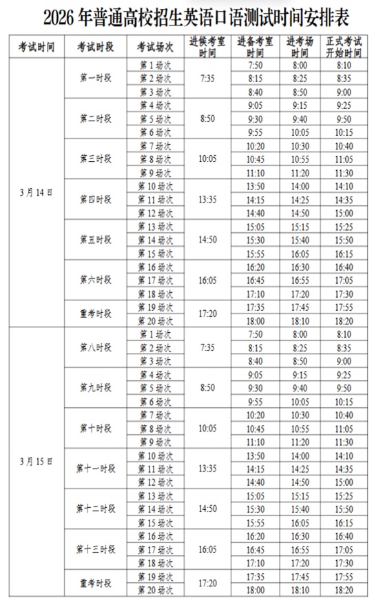 二、考試時間和地點英語口試時間為2026年3月14日至15日,考試場次及具體時間安排見《英語口試時間安排表》(附件1)?忌暮蚩既雸鰰r間和考試地點以準考證上的安排為準,請準時赴考,遵守考試相關要求。