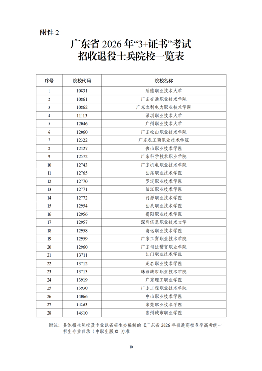 2.廣東省2026年“3+證書”考試招收退役士兵院校一覽表