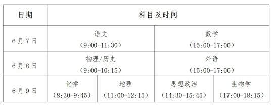 考試時間為6月7日至9日。語文科目考試時長為150分鐘,數(shù)學、外語科目考試時長為120分鐘,選擇性考試科目考試時長均為75分鐘。具體考試時間安排如下:
