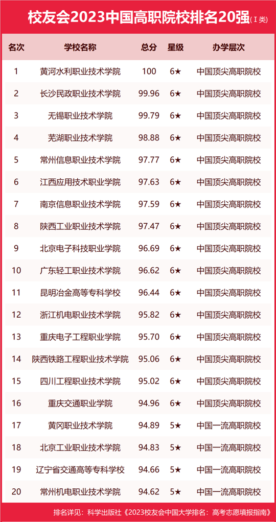 黃河水利職業(yè)技術(shù)學(xué)院高居2023中國(guó)高職院校排名I類第1,無(wú)錫職業(yè)技術(shù)學(xué)院第3