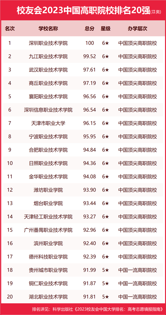 深圳職業(yè)技術(shù)學(xué)院、九江職業(yè)技術(shù)學(xué)院、武漢職業(yè)技術(shù)學(xué)院、商丘職業(yè)技術(shù)學(xué)院、襄陽(yáng)職業(yè)技術(shù)學(xué)院、深圳信息職業(yè)技術(shù)學(xué)院、天津市職業(yè)大學(xué)、寧波職業(yè)技術(shù)學(xué)院、合肥職業(yè)技術(shù)學(xué)院、日照職業(yè)技術(shù)學(xué)院位列校友會(huì)2023中國(guó)高職院校排名Ⅱ類10強(qiáng)。