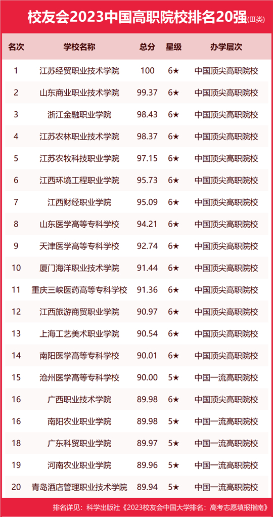江蘇經(jīng)貿(mào)職業(yè)技術(shù)學(xué)院、山東商業(yè)職業(yè)技術(shù)學(xué)院、浙江金融職業(yè)學(xué)院、江蘇農(nóng)林職業(yè)技術(shù)學(xué)院、江蘇農(nóng)牧科技職業(yè)學(xué)院、江西環(huán)境工程職業(yè)學(xué)院、江西財(cái)經(jīng)職業(yè)學(xué)院、山東醫(yī)學(xué)高等?茖W(xué)校、天津醫(yī)學(xué)高等?茖W(xué)校、廈門海洋職業(yè)技術(shù)學(xué)院名列校友會(huì)2023中國(guó)高職院校排名Ⅲ類10強(qiáng)。