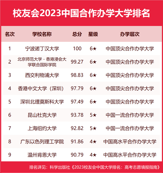| 校友會(huì)2023中國合作辦學(xué)大學(xué)排名,寧波諾丁漢大學(xué)蟬聯(lián)第一 |