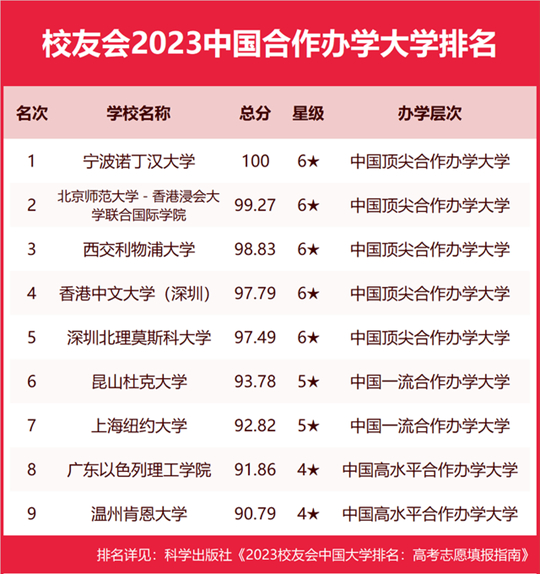 榜單顯示,寧波諾丁漢大學(xué)、北京師范大學(xué)-香港浸會(huì)大學(xué)聯(lián)合國際學(xué)院、西交利物浦大學(xué)、香港中文大學(xué)(深圳)、深圳北理莫斯科大學(xué)雄居校友會(huì)2023中國合作辦學(xué)大學(xué)排名前5強(qiáng)。