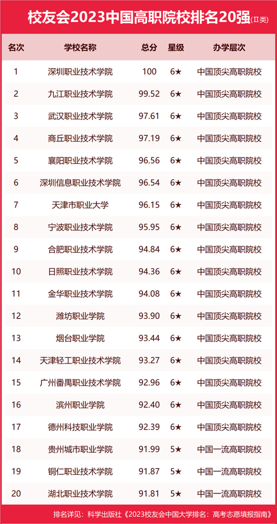 深圳職業(yè)技術(shù)學(xué)院、九江職業(yè)技術(shù)學(xué)院、武漢職業(yè)技術(shù)學(xué)院、商丘職業(yè)技術(shù)學(xué)院、襄陽職業(yè)技術(shù)學(xué)院位列2023中國高職院校排名Ⅱ類前5強(qiáng)。