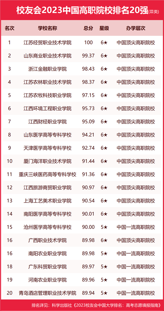 江蘇經(jīng)貿(mào)職業(yè)技術(shù)學(xué)院、山東商業(yè)職業(yè)技術(shù)學(xué)院、浙江金融職業(yè)學(xué)院、江蘇農(nóng)林職業(yè)技術(shù)學(xué)院、江蘇農(nóng)牧科技職業(yè)學(xué)院名列2023中國高職院校排名Ⅲ類前5名。